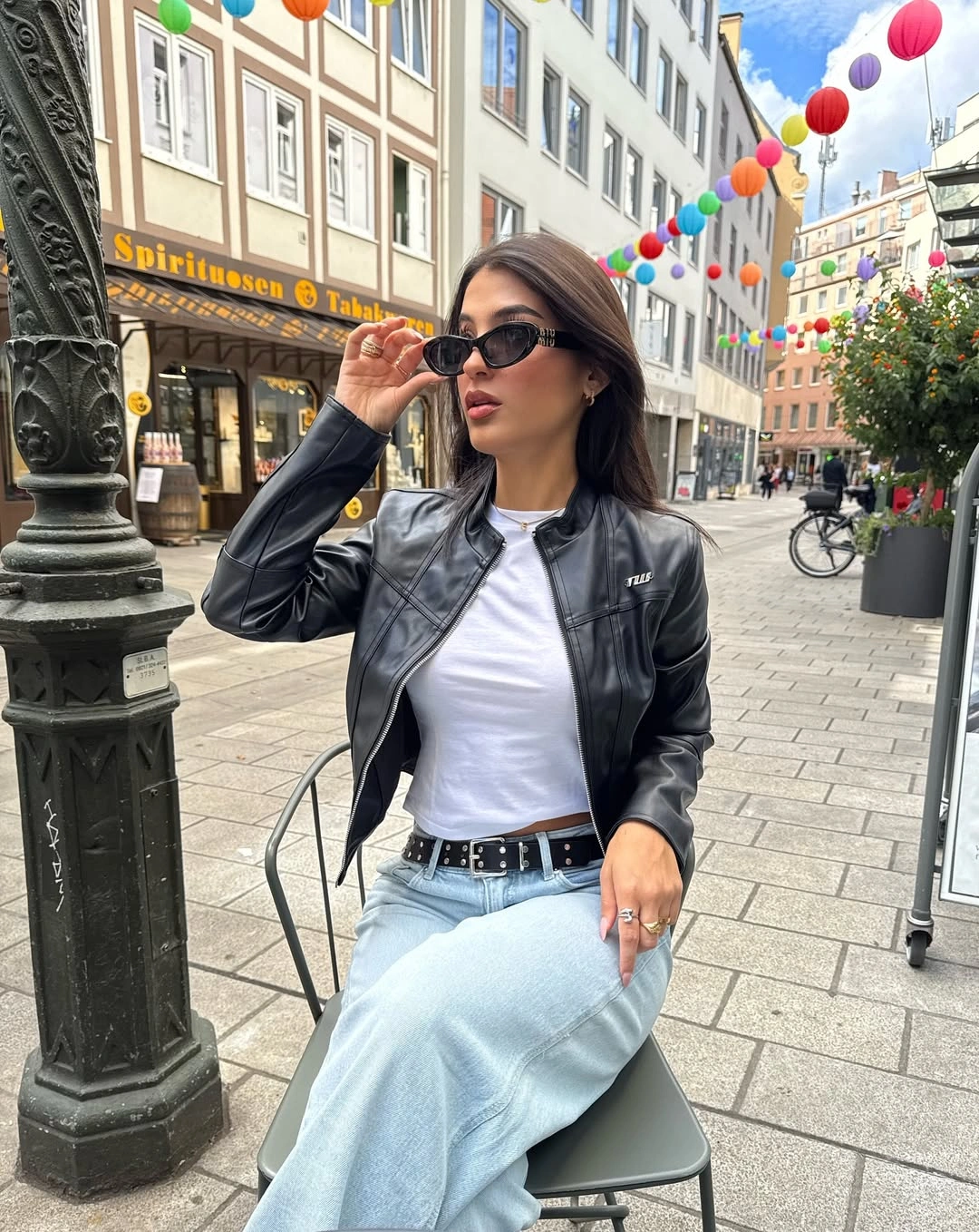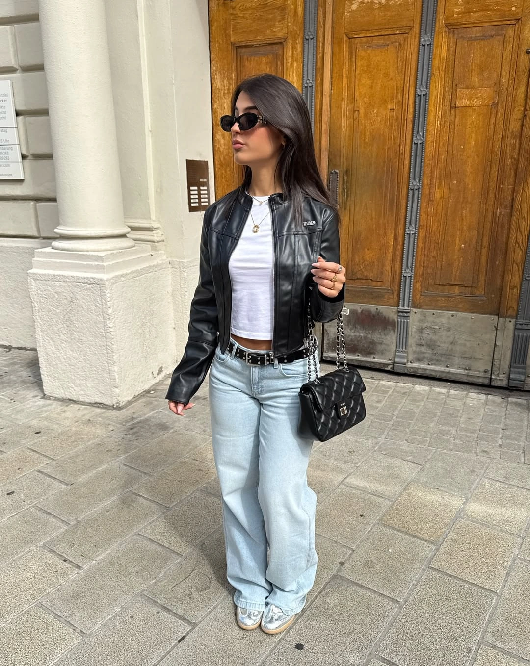 Dein Style Essential. Weißes Shirt, Bikerjacke, Denim Jeans und schwarze Mini Bag für jeden Look.