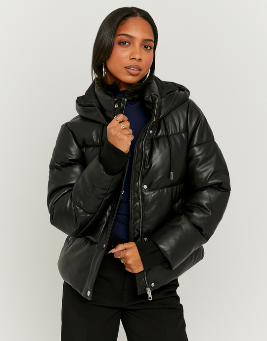 Schwarze loose Puffer Jacke mit Kunstleder