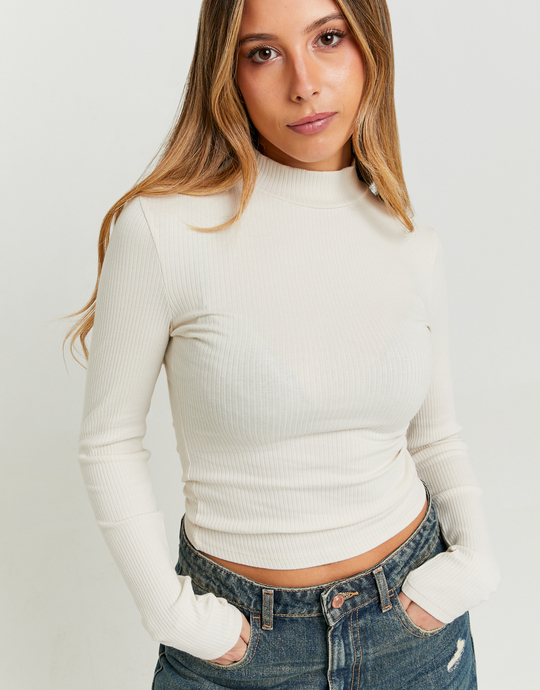 Beiges Basic T‑Shirt mit hohem Kragen