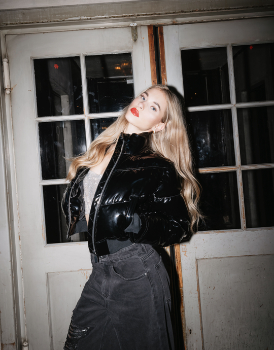 Schwarze Pufferjacke im "Lack‑Look"