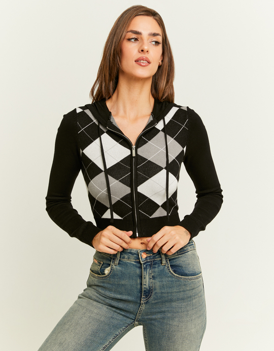 Karierter Strick‑Cardigan mit Kapuze und Reißverschluss