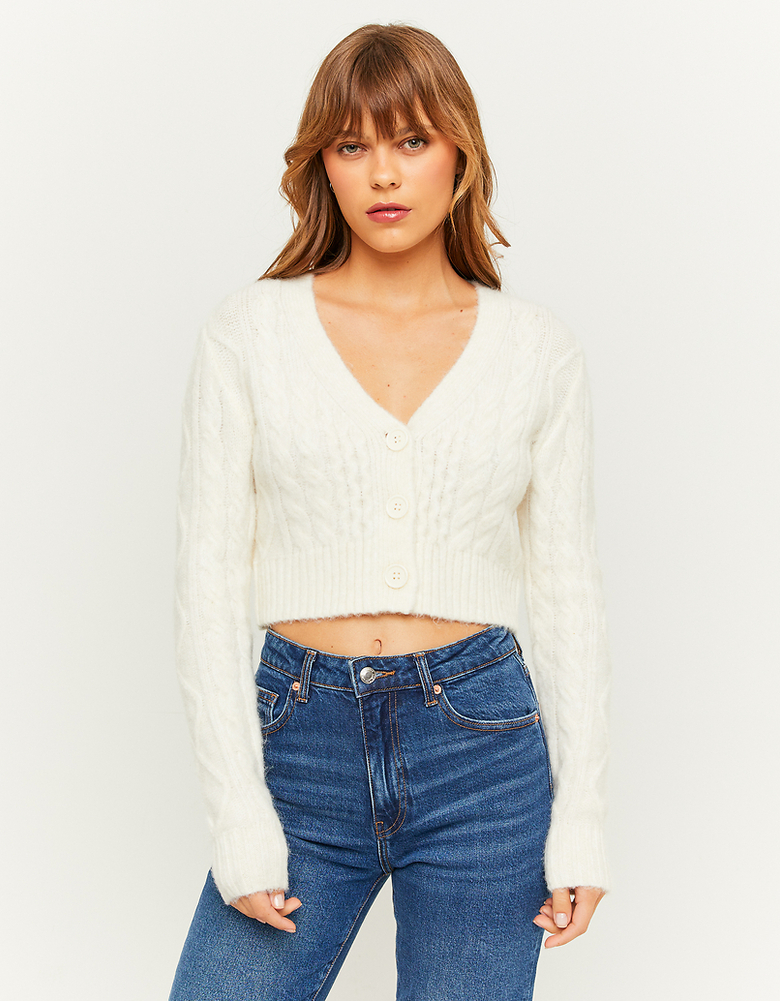 Imagine yourself in our White Cable Knit Cropped Cardigan – the epitome of cozy sophistication. This cardigan is intricately designed with a stylish cable knit pattern that adds texture and charm. Its cropped length and long sleeves offer versatility in layering, making it an excellent choice to complement various outfits. The pristine white color exudes elegance and timeless style, making it a wardrobe essential. Whether you're dressing up for a special occasion or need an extra layer of warmth, this white cable knit cropped cardigan is the perfect choice. ⚪💫😍