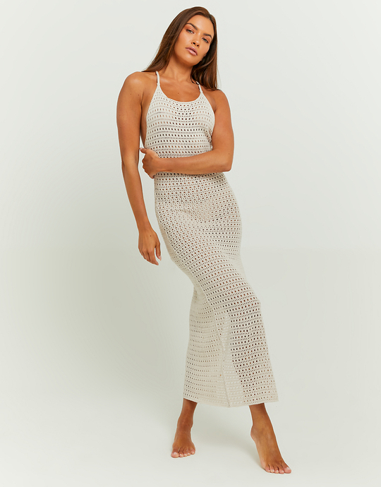 Embrace bohemian romance with our Beige Crochet Maxi Dress! Crafted from delicate crochet fabric, this sleeveless dress features a maxi length for a dreamy and ethereal vibe. The special mention of its back lace-up detail adds a touch of allure, while the soft beige hue complements any summer aesthetic. Perfect for beach weddings, garden parties, or sunset soirees.