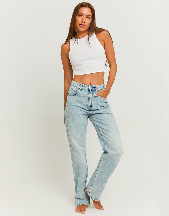 High Waist Straight Leg Jeans with Strass