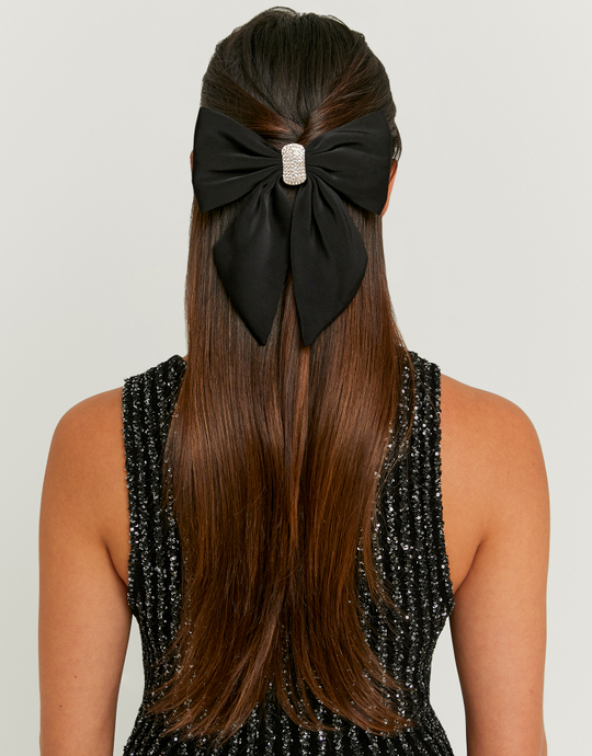 Elegant and chic, this black hair bow with rhinestones is the perfect piece to elevate any hairstyle. The soft material gives it a classic look, while the sparkling stones add that Tally twist of glam. Style it with straight hair, soft curls or a high ponytail for a polished yet playful finish. A must have accessory for both casual and dressy moments.
