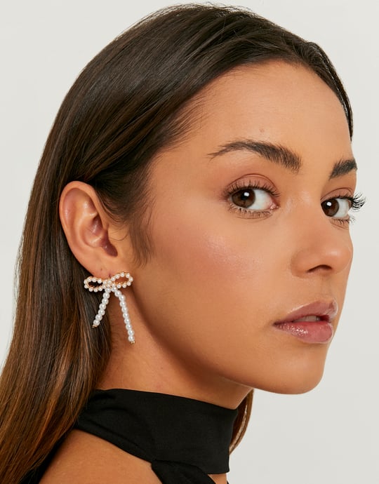 These golden pearl bow earrings add a touch of elegance and charm to any outfit. Designed with delicate pearls forming a bow shape, they combine femininity with a playful twist. The golden finish makes them shine beautifully, perfect for both everyday wear and special occasions. Pair them with a simple top or an evening dress for a refined, graceful look.