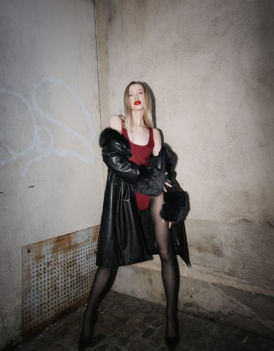 Black Faux Leather Trenchcoat with Faux Fur Details
