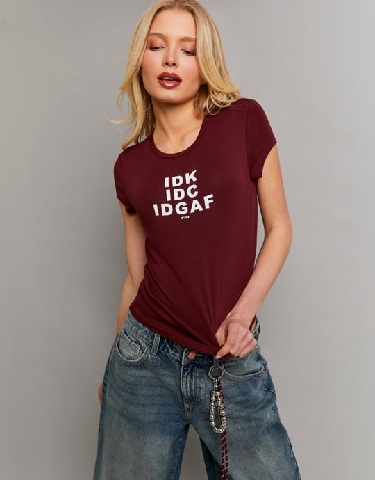 Add depth and personality to your look with this burgundy printed cotton T-shirt. The rich burgundy tone combined with a statement print creates a trendy yet wearable casual piece. Made from soft cotton, it offers breathable comfort, while the fitted cut enhances your silhouette. The round neckline keeps the design classic, balancing the bold print with a timeless touch. Style it with black jeans or a mini skirt for an elevated everyday outfit.