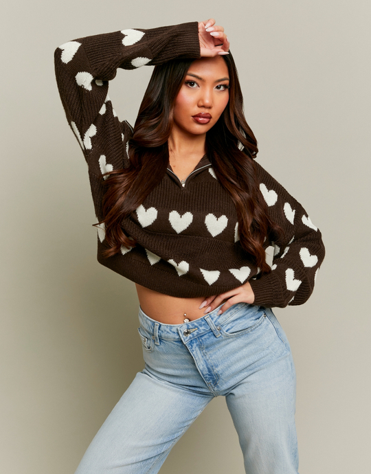 This brown knitted zip up jumper with heart details adds a playful and cozy touch to your wardrobe. Designed with a loose fit, it offers comfort while keeping a relaxed and trendy silhouette. The zip up front allows versatile styling, whether worn open or closed, while the heart pattern brings a soft and feminine feel. Perfect for layering over tops or wearing on its own, this jumper is ideal for casual days with a charming Tally Weijl twist.