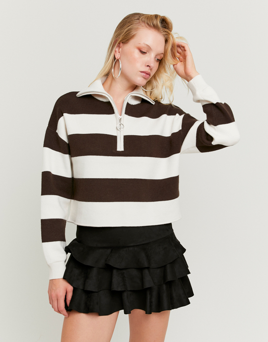 Refresh your casual wardrobe with this white striped jumper featuring brown accents. Crafted in soft knit fabric, it comes with a flattering V-neck and a zip-up front for easy layering. The striped pattern adds a timeless, sporty vibe. Perfect for pairing with jeans, joggers, or skirts for a laid-back yet stylish look. TALLY WEIJL is a proud member of Better Cotton. By choosing our cotton products, you’re supporting our investment in Better Cotton’s mission. Better Cotton is sourced via a chain of custody model called mass balance. This means that Better Cotton is not physically traceable to end products, however Better Cotton Farmers benefit from the demand for Better cotton in equivalent volumes to those we “source”.