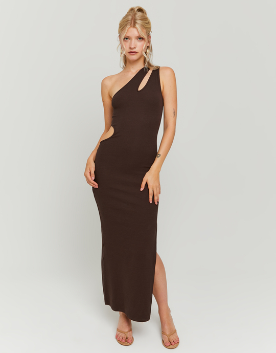 Turn heads in this stunning brown long dress with a chic one-shoulder design and bold cut-out details. The fitted silhouette flatters your shape, while the full length adds a touch of timeless elegance. Made from smooth and stretchy fabric, it’s as comfortable as it is eye-catching. Whether you're heading to a party, special occasion, or night out, this dress brings just the right balance of confidence and style. Complete the look with heels and statement accessories for an unforgettable outfit. TALLY WEIJL is a proud member of Better Cotton. By choosing our cotton products, you’re supporting our investment in Better Cotton’s mission. Better Cotton is sourced via a chain of custody model called mass balance. This means that Better Cotton is not physically traceable to end products, however Better Cotton Farmers benefit from the demand for Better cotton in equivalent volumes to those we “source”.