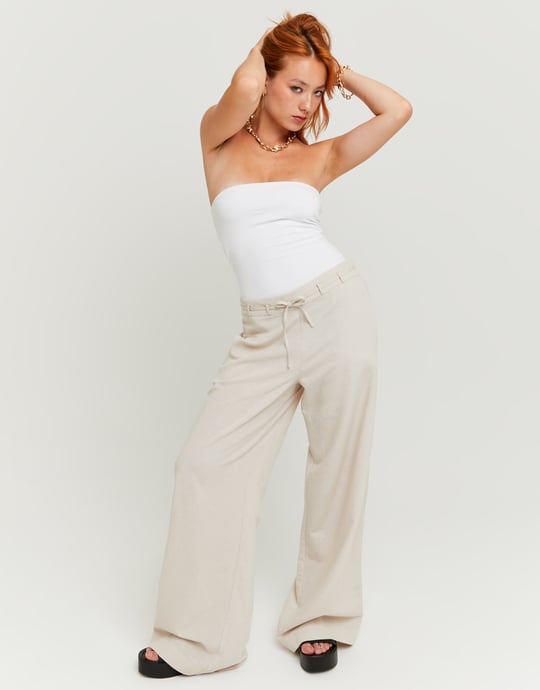 Step into comfort and style with these beige wide-leg linen trousers – perfect for laid-back, relaxed looks. The low-rise waist adds a casual vibe, while the wide-leg cut offers an airy, effortless feel that keeps you comfortable all day long. Made from breathable linen, these trousers keep you cool whether you're running errands or enjoying a chilled-out brunch. The neutral beige color makes them super versatile and easy to style – from basic tees to chic blouses. Light, breezy, and effortlessly stylish, they’re a must-have for anyone who loves to mix comfort with trend-driven fashion. Pair them with heels for a dressy edge or go for sandals to keep it casual – your style, your rules. Don’t miss out on these statement trousers that bring a fresh twist to your everyday wardrobe!