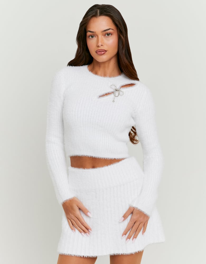 Shine bright in this white cropped knit jumper. Designed with sparkling rhinestone details and chic cut outs, it brings that glam edge to your everyday style. The soft knit fabric and round neck keep it cozy yet stylish, perfect for layering or standing out on its own. Pair it with a mini skirt or high waist jeans for a bold, confident look that catches every light.