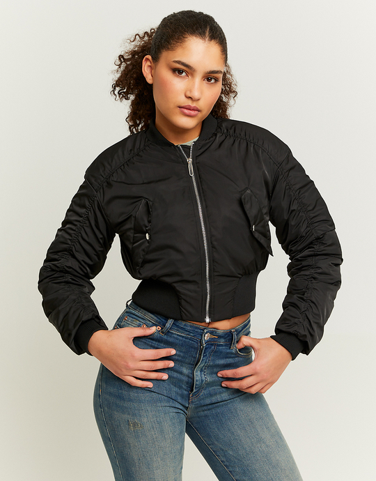 Elevate your street style with our Black Cropped Bomber Jacket. This edgy piece features classic bomber jacket details like a ribbed collar and cuffs, adding a sporty-chic vibe to any ensemble. The cropped length adds a modern twist, making it perfect for layering over dresses or pairing with high-waisted jeans for a trendy look.