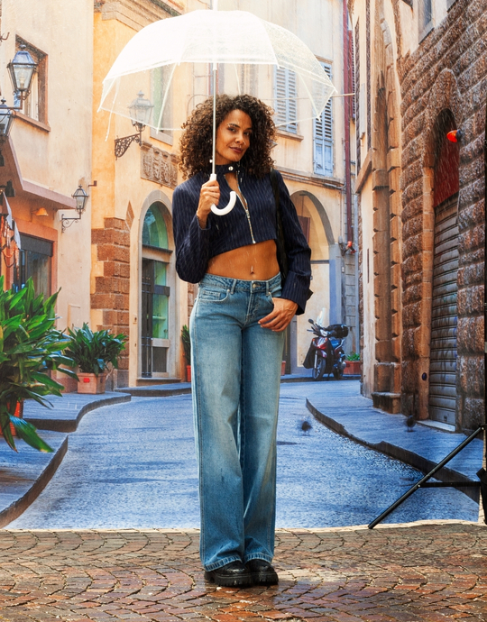 Ce blazer court bleu à fines rayures revisite le tailoring avec une touche moderne. Sa coupe ajustée et zippée dessine une silhouette affirmée et élégante. Idéal pour un look de bureau stylé ou un outfit city casual. À associer à un pantalon taille haute pour un effet allongé. Un essentiel à la fois chic et audacieux.
