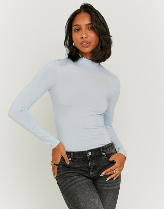 Ce t-shirt bleu à col montant est un basique revisité, à la fois confortable et stylé. Sa matière douce et sa coupe ajustée le rendent agréable à porter au quotidien. À associer avec un jean, une jupe ou sous un blazer pour un look simple et tendance.