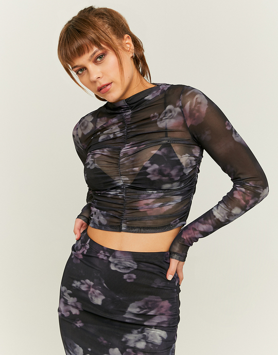 Top en mesh noir avec imprimé floral