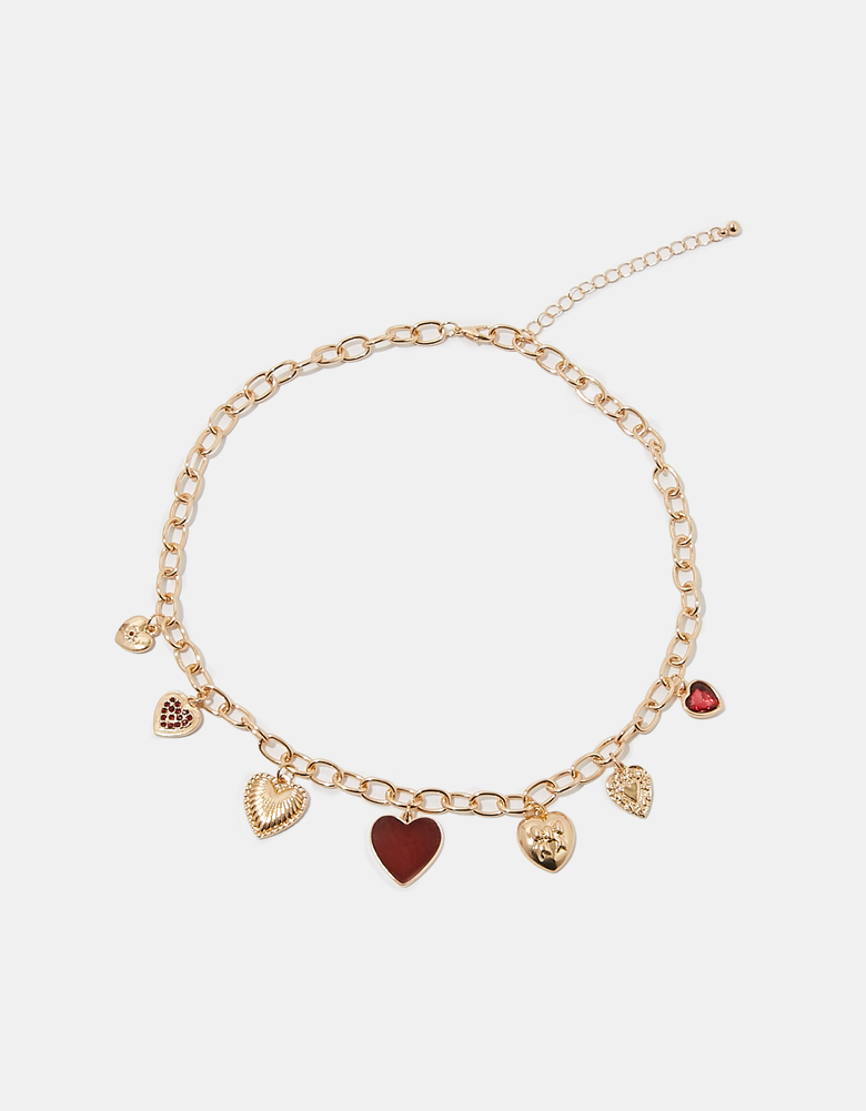 Romantic and delicate, this golden necklace with heart shaped charms is made to steal the spotlight. Each tiny charm shines softly against your skin, creating a feminine and elegant look. Ideal for layering or wearing on its own, it brings warmth and sweetness to every outfit.