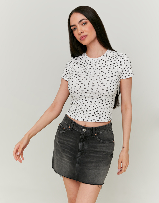 This basic floral printed t-shirt is the perfect piece to add a touch of freshness and femininity to your daily look. Made from soft cotton, it’s super comfy to wear and lets your skin breathe, making it ideal for sunny days. The floral pattern on a white background gives it a spring-like vibe, and it’s easy to pair with jeans, a skirt, or shorts for a casual and charming look. With its classic cut and short sleeves, it’s the kind of t-shirt you can throw on without thinking for an instant stylish effect. It’s perfect for any occasion, whether it’s a walk, a picnic, or a day of relaxation. This reimagined basic is one we love for its simplicity and romantic little touch. TALLY WEIJL is a proud member of Better Cotton. By choosing our cotton products, you’re supporting our investment in Better Cotton’s mission. Better Cotton is sourced via a chain of custody model called mass balance. This means that Better Cotton is not physically traceable to end products, however Better Cotton Farmers benefit from the demand for Better cotton in equivalent volumes to those we “source”.