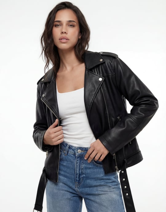 This black faux leather biker jacket brings a bold, modern edge to any outfit. Designed with classic moto details including wide lapels and a structured silhouette, it creates a confident statement look. Perfect to layer over tops or dresses for casual and going-out styling.