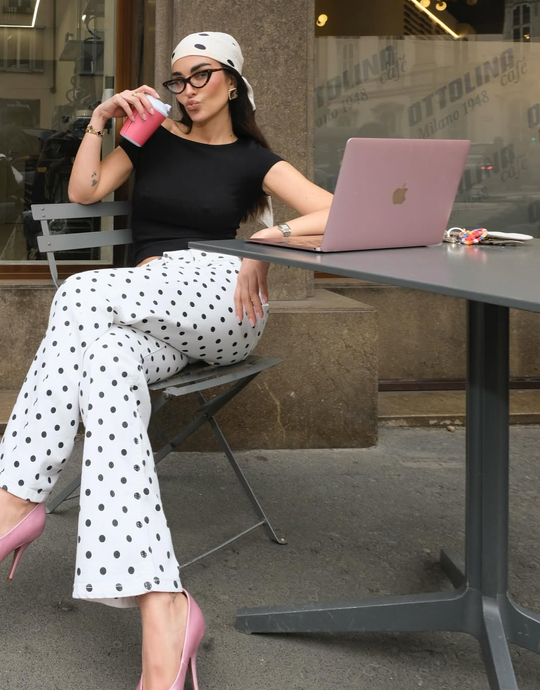 Add a playful twist to your wardrobe with these white polka dot trousers. Designed with a flattering mid-waist fit and a classic straight-leg cut, they offer a clean, balanced silhouette that’s easy to style. The all-over black dot print brings a fun, retro-inspired vibe, while the comfortable fabric makes them perfect for all-day wear. Pair them with a fitted top or a cropped tee for an effortlessly chic look—ideal for casual days, city outings, or relaxed weekend plans.
