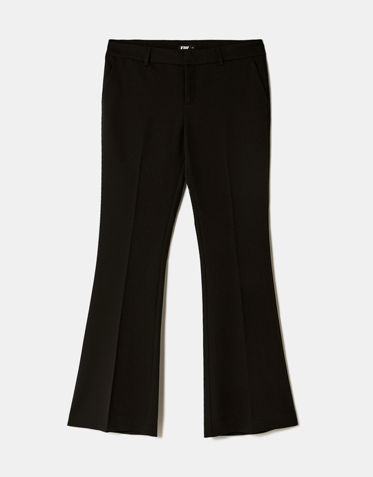 Questo pantalone nero a vita bassa ha una linea flare che valorizza la silhouette. Moderno e versatile, è perfetto per un look casual contemporaneo.