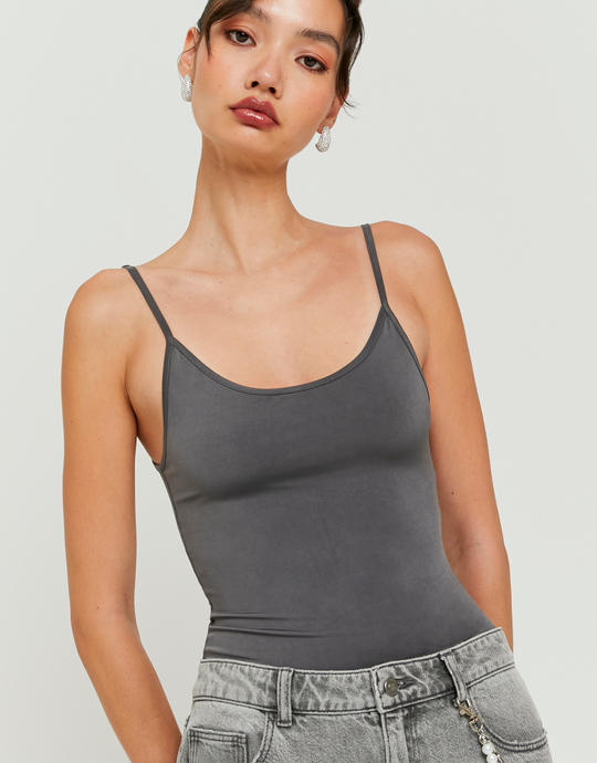 This basic grey bodysuit is all about comfort and versatility. The fitted cut and round neck create a clean, flattering silhouette, while the sleeveless style makes it ideal for warm weather. Wear it under a blazer for a smart vibe or with denim for casual days.