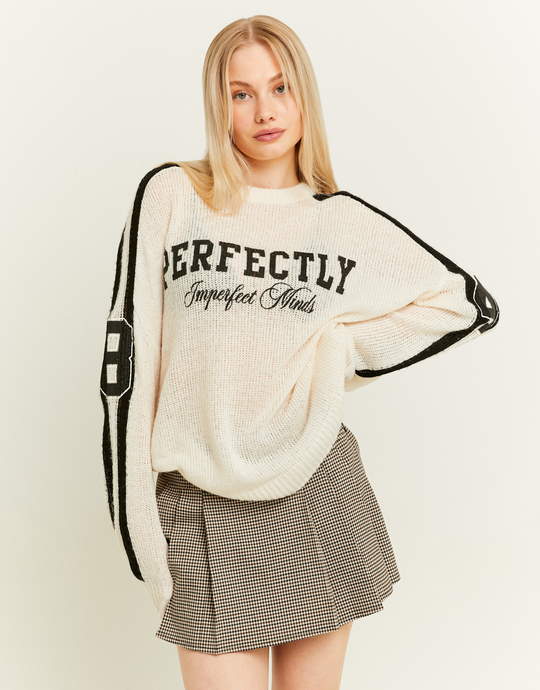 Stay warm and stylish with this Oversize White Knit Jumper! Perfect for cozy days, this varsity-inspired jumper features a comfy oversized fit and soft knit fabric. The round neck and long sleeves add to its laid-back charm, while the subtle embroidery gives it a trendy touch. Ideal for pairing with leggings or your favorite jeans, this jumper is all about effortless style and comfort. Whether you're lounging at home or stepping out with friends, this jumper is your go-to for a relaxed yet fashionable look!