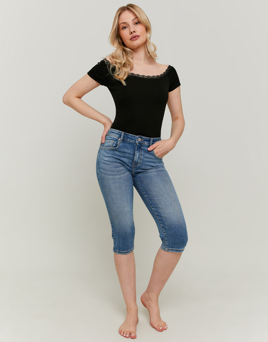 Get that easy summer vibe with these blue capri jeans. The cropped length shows off your ankles, giving you a breezy, playful look that still feels pulled together. They’re made from stretch denim, so they move with you comfortably all day. Dress them up with wedges and a flowy blouse or down with sneakers and a tank. These capris are your warm-weather BFF—easygoing, flattering, and fun to style.