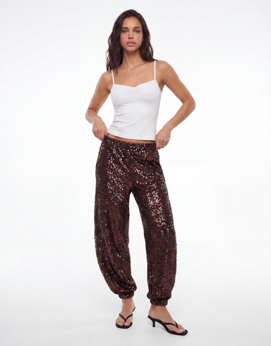 This brown sequined balloon trouser is designed to stand out. Featuring a low waist and a voluminous balloon fit, it creates a bold and fashion-forward silhouette. The sequined surface with strass details adds shine and texture, making it perfect for going-out or party looks. The elasticated waistband ensures comfort while keeping the fit secure. Easy to style with fitted tops or statement pieces, this trouser brings a confident and elevated touch to summer outfits.